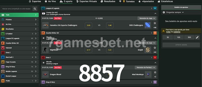 O 8857 oferece uma grande seleção de opções de apostas em e-sports com probabilidades competitivas